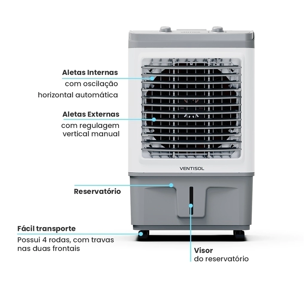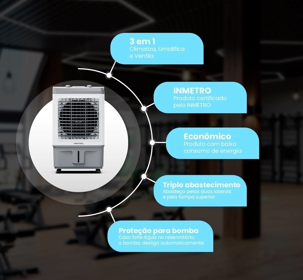 O climatizador evaporativo possui um ventilador que aspira o ar externo através de um painel evaporativo, em que água é circulada continuamente por uma pequena bomba. O climatizador é um equipamento de grande eficiência, compacto, simples, durável e de baixo custo de manutenção, produz um ar limpo de excelente qualidade, e resfria abaixo da temperatura do ar externo, com economia de energia de 90% em relação ao ar condicionado. Climatizador de Ar Evaporativo Portátil, climatiza uma área de até 20 a 40m².